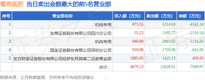 证券之星消息,沪深交易所2025年12月31日公布的交易公开信息显示,鹭燕医药(002788)因日跌幅偏离值达到7%的前5只证券登上龙虎榜。此次是近5个交易日内第1次上榜。