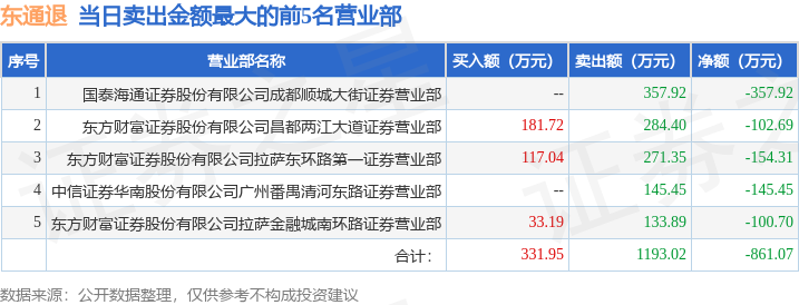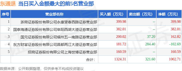 证券之星消息,沪深交易所2025年12月31日公布的交易公开信息显示,东通退(300379)因退市整理期登上龙虎榜。此次是近5个交易日内第2次上榜。
