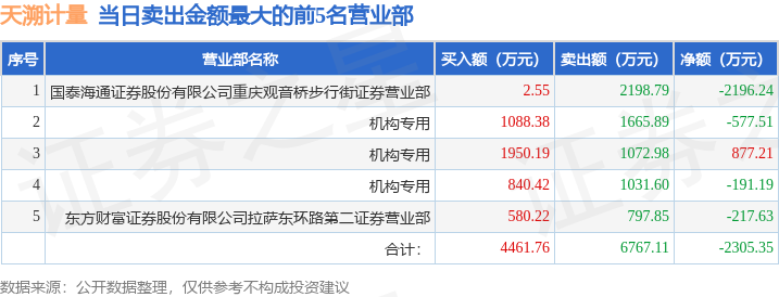 证券之星消息,沪深交易所2025年12月31日公布的交易公开信息显示,天溯计量(301449)因日换手率达到30%的前5只证券登上龙虎榜。此次是近5个交易日内第2次上榜。