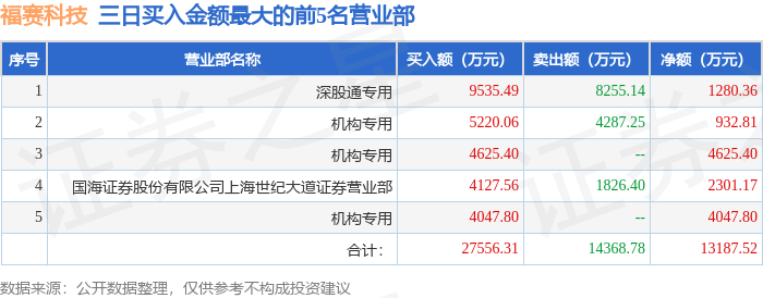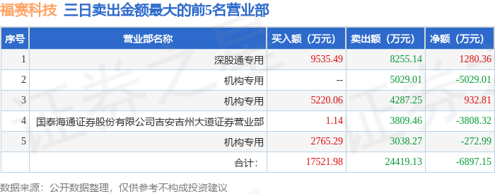 证券之星消息,沪深交易所2025年12月31日公布的交易公开信息显示,福赛科技(301529)因连续三个交易日内,涨幅偏离值累计达到30%的证券登上龙虎榜。此次是近5个交易日内第1次上榜。