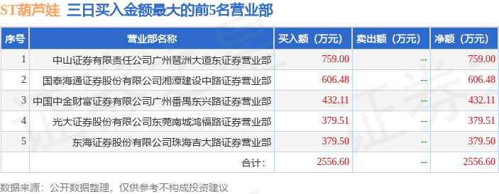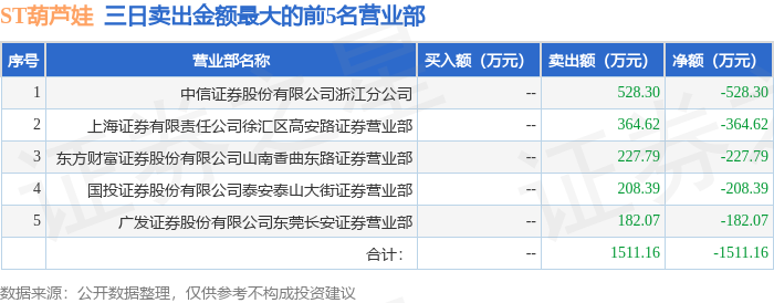 证券之星消息,沪深交易所2025年12月31日公布的交易公开信息显示,ST葫芦娃(605199)因ST、*ST证券连续三个交易日内收盘价格跌幅偏离值累计达到12%的证券登上龙虎榜。此次是近5个交易日内第1次上榜。