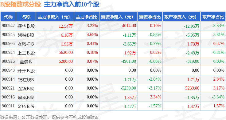 资金流向方面,B股指数(000003)成份股当日主力资金净流出合计35.13万元,游资资金净流出合计21.61万元,散户资金净流入合计56.74万元。成份股资金流向详情见下表: