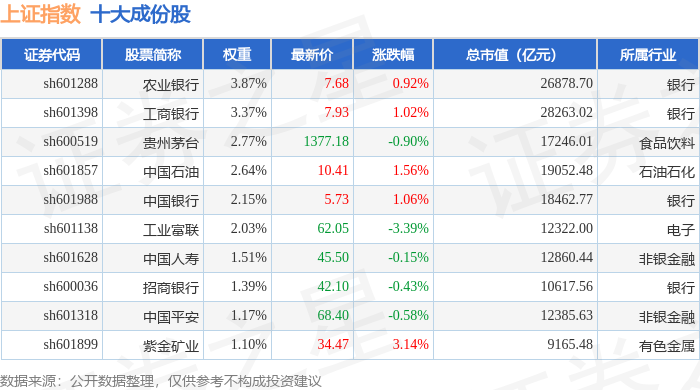 上证指数(000001)十大成份股详情如下:
