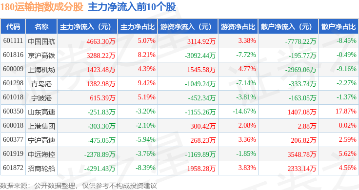 资金流向方面,180运输(000027)指数成份股当日主力资金净流出合计7949.84万元,游资资金净流入合计7381.88万元,散户资金净流入合计567.96万元。成份股资金流向详情见下表: