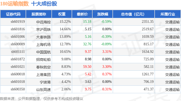 证券之星消息,12月31日,180运输(000027)指数报收于773.79点,涨0.54%,成交42.46亿元,换手率0.3%。当日该指数成份股中,上涨的有6家,中国国航以3.31%的涨幅领涨,下跌的有3家,中远海控以0.59%的跌幅领跌。