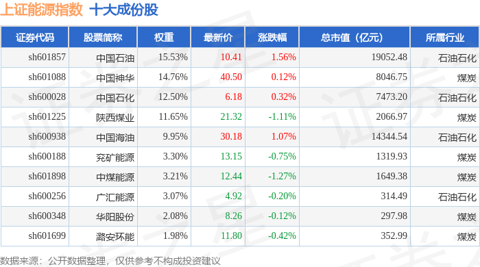 上证能源(000032)指数十大成份股详情如下:
