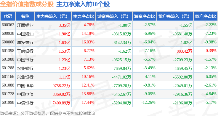 资金流向方面,全指价值(000058)指数成份股当日主力资金净流出合计16.46亿元,游资资金净流出合计1.75亿元,散户资金净流入合计18.2亿元。成份股资金流向详情见下表: