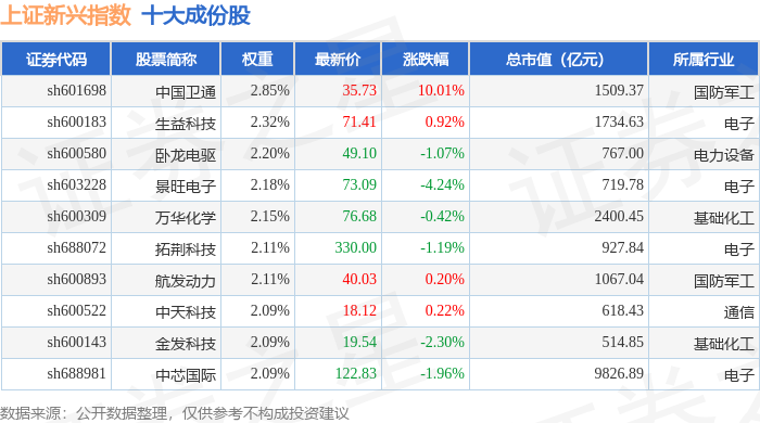 上证新兴(000067)指数十大成份股详情如下: