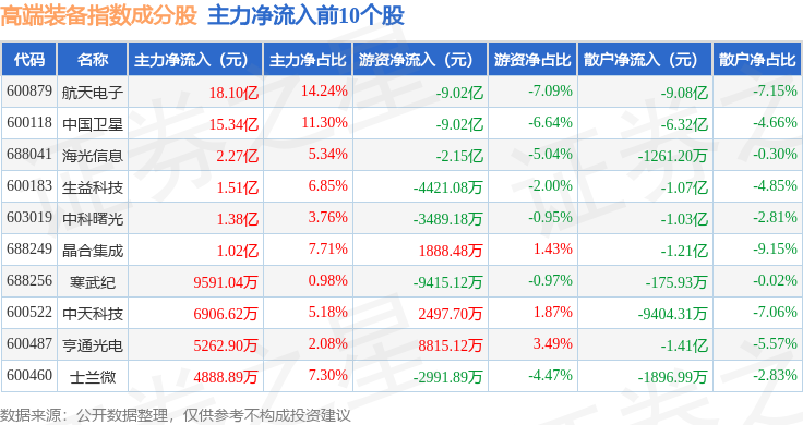 资金流向方面,高端装备(000097)指数成份股当日主力资金净流出合计30.92亿元,游资资金净流入合计4.11亿元,散户资金净流入合计26.81亿元。成份股资金流向详情见下表: