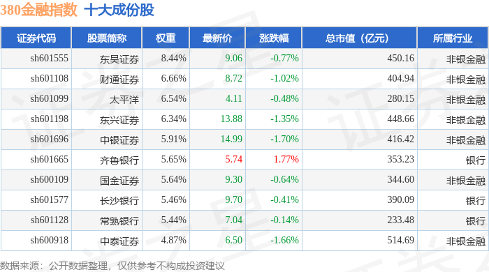 证券之星消息,12月31日,380金融(000110)指数报收于4253.03点,跌0.58%,成交62.93亿元,换手率0.85%。当日该指数成份股中,上涨的有2家,齐鲁银行以1.77%的涨幅领涨,下跌的有18家,中银证券以1.7%的跌幅领跌。