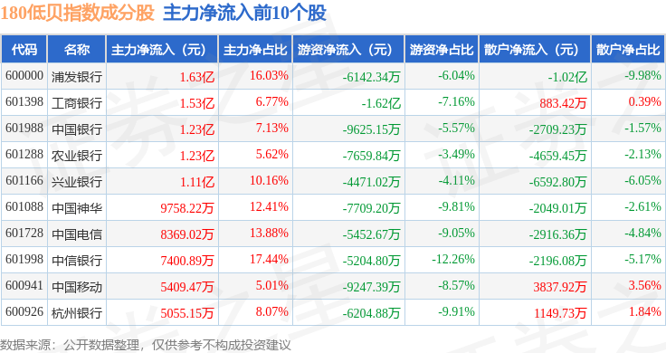资金流向方面,180低贝(000136)指数成份股当日主力资金净流入合计5495.21万元,游资资金净流出合计6.18亿元,散户资金净流入合计5.63亿元。成份股资金流向详情见下表: