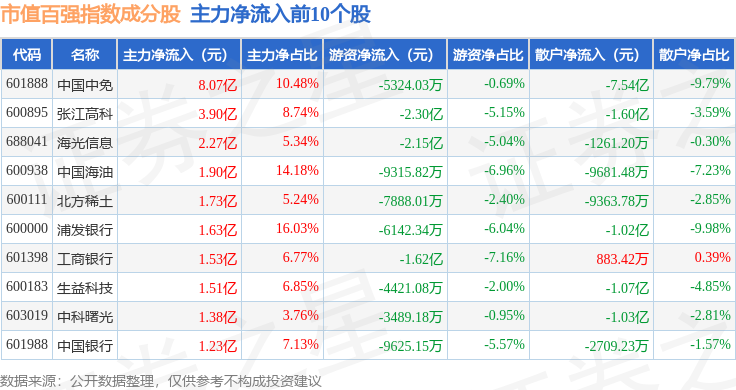 资金流向方面,市值百强(000155)指数成份股当日主力资金净流出合计67.81亿元,游资资金净流入合计16.94亿元,散户资金净流入合计50.87亿元。成份股资金流向详情见下表: