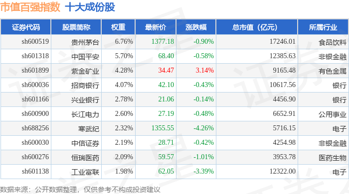 市值百强(000155)指数十大成份股详情如下: