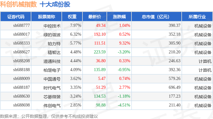 证券之星消息,12月31日,科创机械(000693)指数报收于1427.11点,涨0.02%,成交176.93亿元,换手率1.18%。当日该指数成份股中,上涨的有19家,铂力特以9.32%的涨幅领涨,下跌的有30家,伟创电气以4.51%的跌幅领跌。