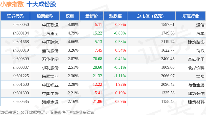 小康指数(000901)十大成份股详情如下: