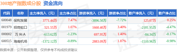资金流向方面,300地产(000952)指数成份股当日主力资金净流入合计2307.25万元,游资资金净流入合计1344.93万元,散户资金净流出合计3652.18万元。成份股资金流向详情见下表: