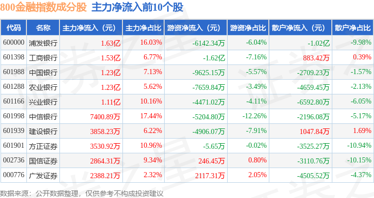 资金流向方面,800金融(000974)指数成份股当日主力资金净流出合计1.78亿元,游资资金净流出合计1.36亿元,散户资金净流入合计3.14亿元。成份股资金流向详情见下表:
