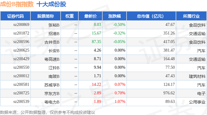 资金流向方面,成份B指(399003)指数成份股当日主力资金净流入合计97.35万元,游资资金净流出合计108.48万元,散户资金净流入合计11.13万元。成份股资金流向详情见下表: