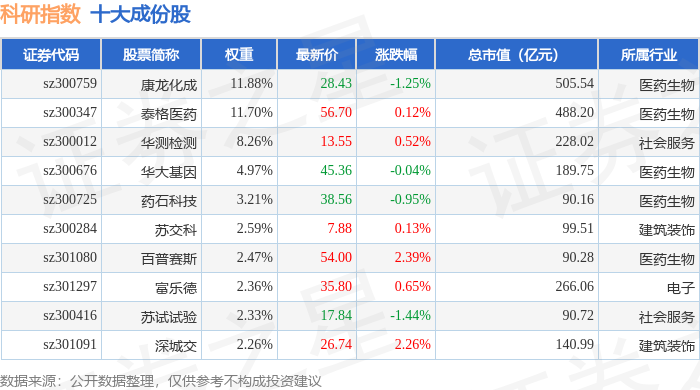 证券之星消息,12月31日,科研指数(399243)报收于1446.82点,涨0.26%,成交88.69亿元,换手率1.83%。当日该指数成份股中,上涨的有44家,西测测试以6.24%的涨幅领涨,下跌的有18家,矩阵股份以3.33%的跌幅领跌。