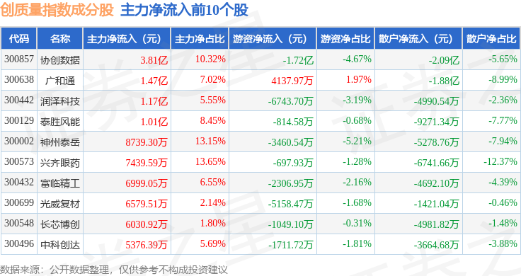 资金流向方面,创质量(399269)指数成份股当日主力资金净流出合计85.77亿元,游资资金净流入合计37.73亿元,散户资金净流入合计48.04亿元。成份股资金流向详情见下表: