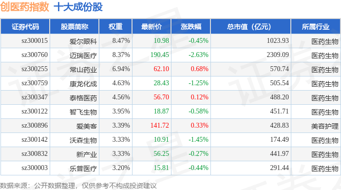 证券之星消息,12月31日,创医药(399275)指数报收于2609.42点,跌0.58%,成交114.81亿元,换手率1.03%。当日该指数成份股中,上涨的有14家,迪安诊断以2.79%的涨幅领涨,下跌的有34家,美好医疗以3.8%的跌幅领跌。