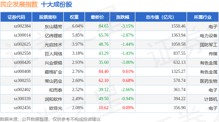 民企发展(399292)指数十大成份股详情如下: