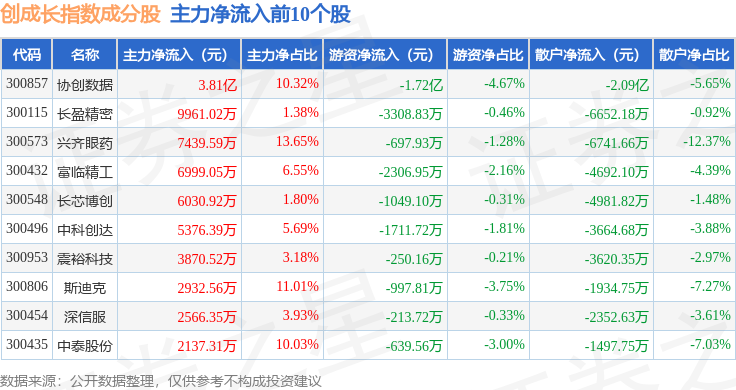 资金流向方面,创成长(399296)指数成份股当日主力资金净流出合计91.45亿元,游资资金净流入合计36.02亿元,散户资金净流入合计55.44亿元。成份股资金流向详情见下表: