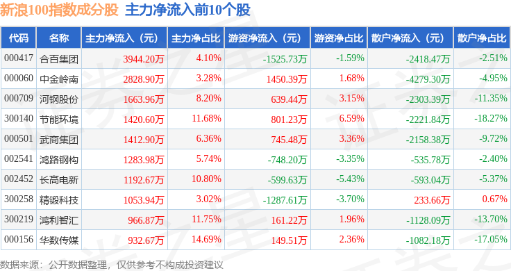 资金流向方面,新浪100(399297)指数成份股当日主力资金净流出合计6.89亿元,游资资金净流入合计2.35亿元,散户资金净流入合计4.54亿元。成份股资金流向详情见下表: