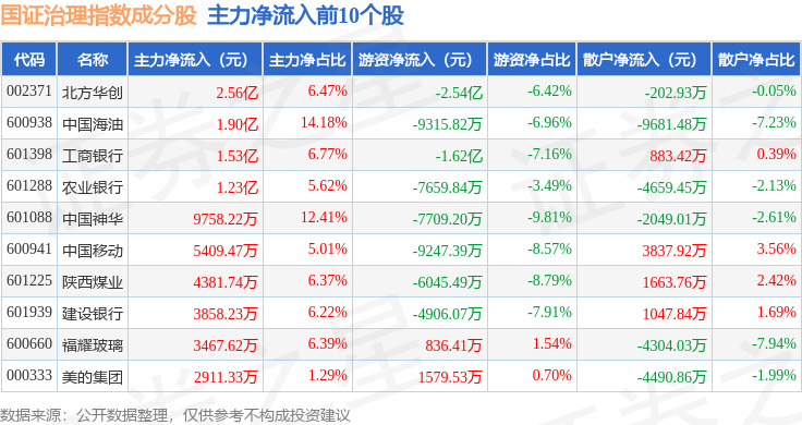资金流向方面,国证治理(399322)指数成份股当日主力资金净流出合计101.76亿元,游资资金净流入合计30.91亿元,散户资金净流入合计70.85亿元。成份股资金流向详情见下表: