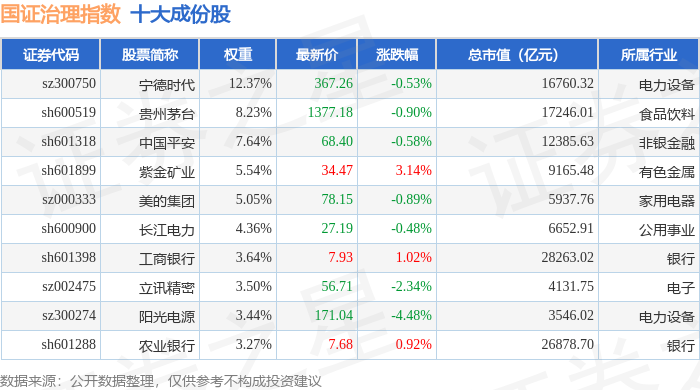 国证治理(399322)指数十大成份股详情如下: