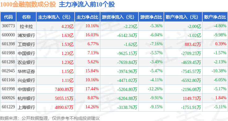 资金流向方面,1000金融(399387)指数成份股当日主力资金净流出合计9.33亿元,游资资金净流入合计1.49亿元,散户资金净流入合计7.84亿元。成份股资金流向详情见下表:
