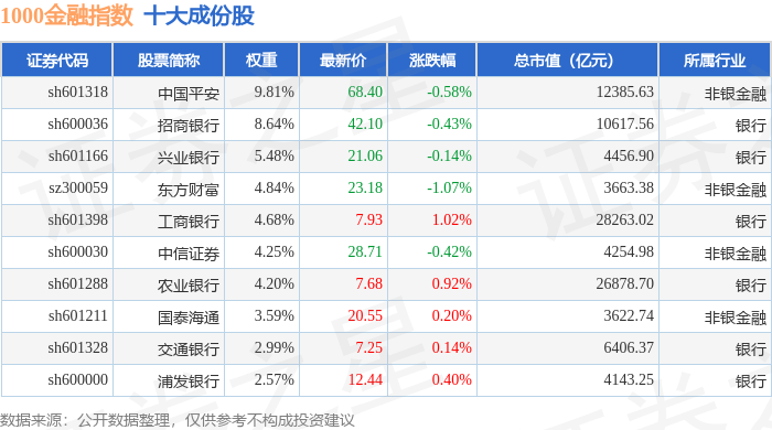 1000金融(399387)指数十大成份股详情如下: