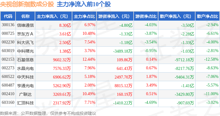资金流向方面,央视创新(399551)指数成份股当日主力资金净流出合计35.75亿元,游资资金净流入合计9.85亿元,散户资金净流入合计25.9亿元。成份股资金流向详情见下表:
