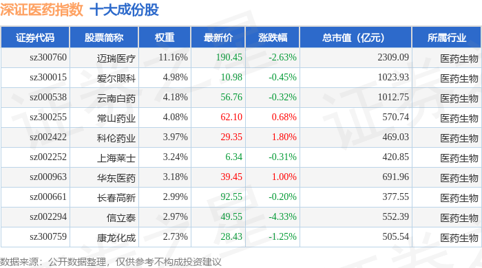 深证医药(399618)指数十大成份股详情如下:
