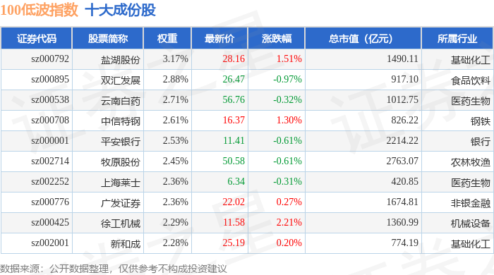 100低波(399645)指数十大成份股详情如下: