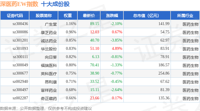 深医药EW(399676)指数十大成份股详情如下: