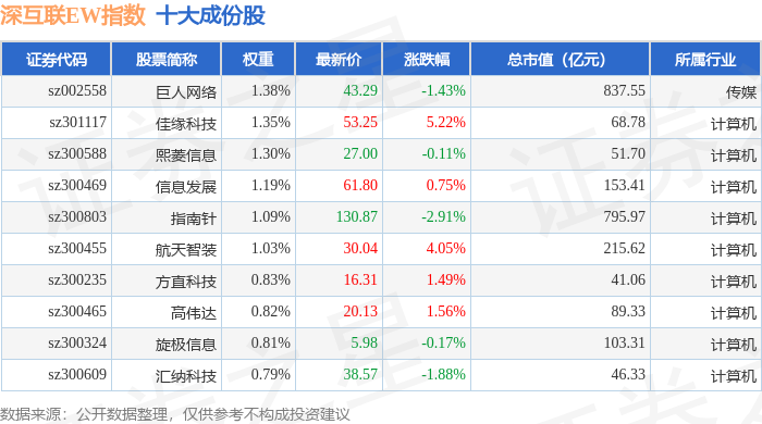 证券之星消息,12月31日,深互联EW(399677)指数报收于5626.26点,涨1.34%,成交742.9亿元,换手率3.4%。当日该指数成份股中,上涨的有128家,中科江南以20.0%的涨幅领涨,下跌的有35家,数字认证以3.94%的跌幅领跌。