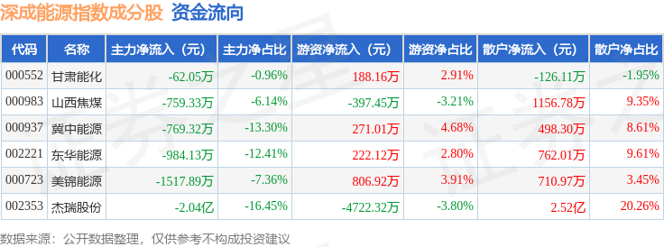 资金流向方面,深成能源(399680)指数成份股当日主力资金净流出合计2.45亿元,游资资金净流出合计3631.56万元,散户资金净流入合计2.82亿元。成份股资金流向详情见下表: