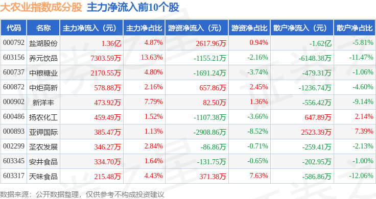 资金流向方面,大农业(399814)指数成份股当日主力资金净流出合计5.98亿元,游资资金净流入合计2.59亿元,散户资金净流入合计3.39亿元。成份股资金流向详情见下表: