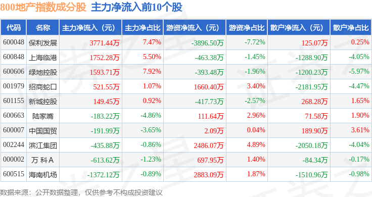 资金流向方面,800地产(399965)指数成份股当日主力资金净流入合计1702.66万元,游资资金净流入合计3698.37万元,散户资金净流出合计5401.02万元。成份股资金流向详情见下表: