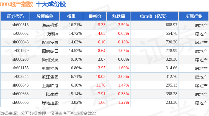 800地产(399965)指数十大成份股详情如下:
