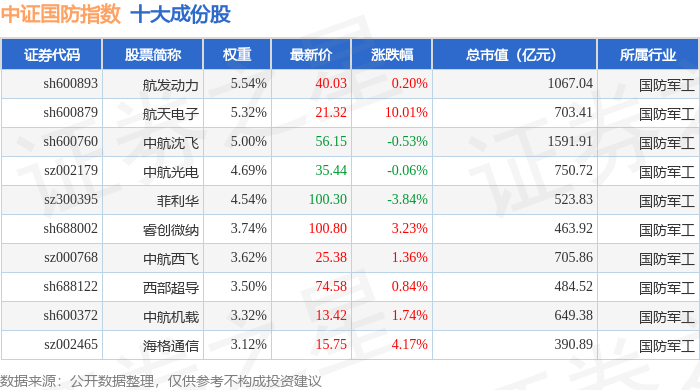 中证国防(399973)指数十大成份股详情如下: