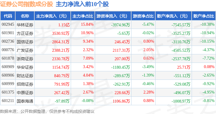 资金流向方面,证券公司(399975)指数成份股当日主力资金净流出合计15.04亿元,游资资金净流入合计8.95亿元,散户资金净流入合计6.08亿元。成份股资金流向详情见下表: