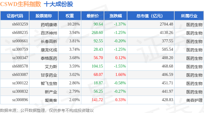 CSWD生科(399993)指数十大成份股详情如下: