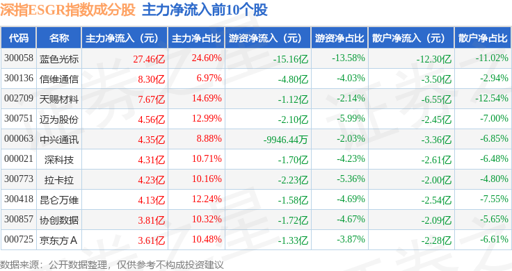 资金流向方面,深指ESGR(470026)指数成份股当日主力资金净流出合计128.56亿元,游资资金净流入合计28.0亿元,散户资金净流入合计100.56亿元。成份股资金流向详情见下表: