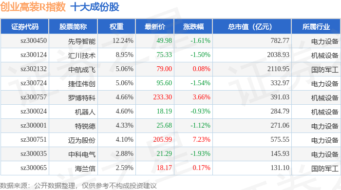 证券之星消息,12月31日,创业高装R(470040)指数报收于4604.5点,涨0.34%,成交377.76亿元,换手率4.94%。当日该指数成份股中,上涨的有22家,爱乐达以11.61%的涨幅领涨,下跌的有28家,固高科技以3.73%的跌幅领跌。