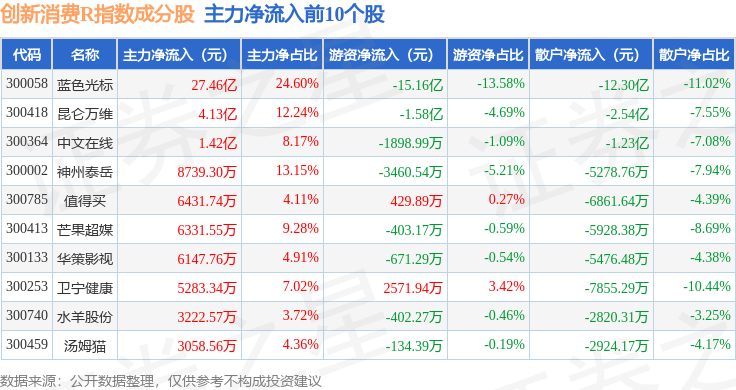 资金流向方面,创新消费R(470041)指数成份股当日主力资金净流入合计35.68亿元,游资资金净流出合计16.12亿元,散户资金净流出合计19.56亿元。成份股资金流向详情见下表: