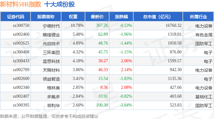 证券之星消息,12月31日,新材料50R(470042)指数报收于4255.72点,跌0.49%,成交688.45亿元,换手率2.67%。当日该指数成份股中,上涨的有16家,中简科技以5.18%的涨幅领涨,下跌的有33家,菲利华以3.84%的跌幅领跌。