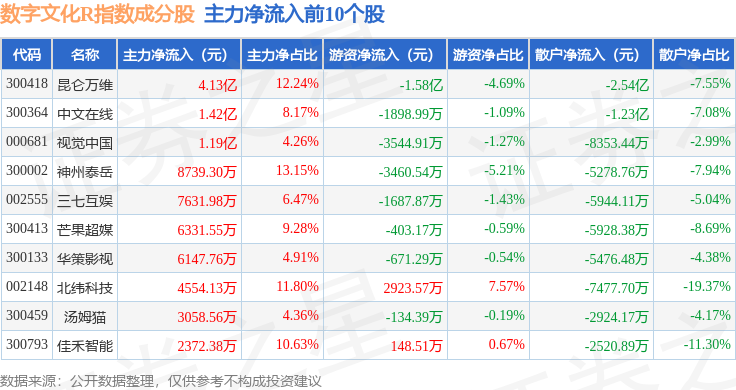 资金流向方面,数字文化R(470047)指数成份股当日主力资金净流入合计4.73亿元,游资资金净流出合计1.05亿元,散户资金净流出合计3.68亿元。成份股资金流向详情见下表: