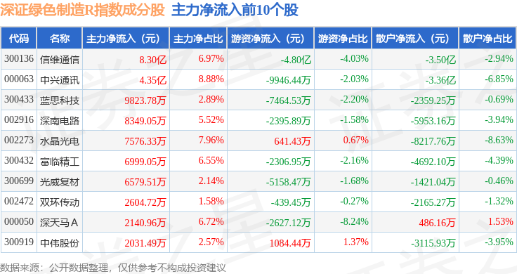 资金流向方面,深证绿色制造R(470069)指数成份股当日主力资金净流出合计47.66亿元,游资资金净流入合计13.49亿元,散户资金净流入合计34.18亿元。成份股资金流向详情见下表: